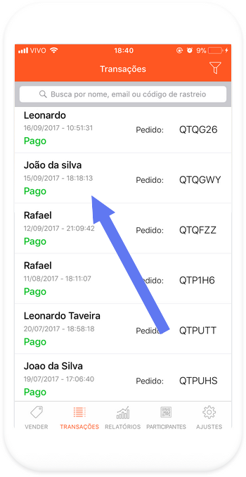 1) Acesse a aba "Transações" e aperte no nome do comprador que deseja fazer a alteração de nome.
